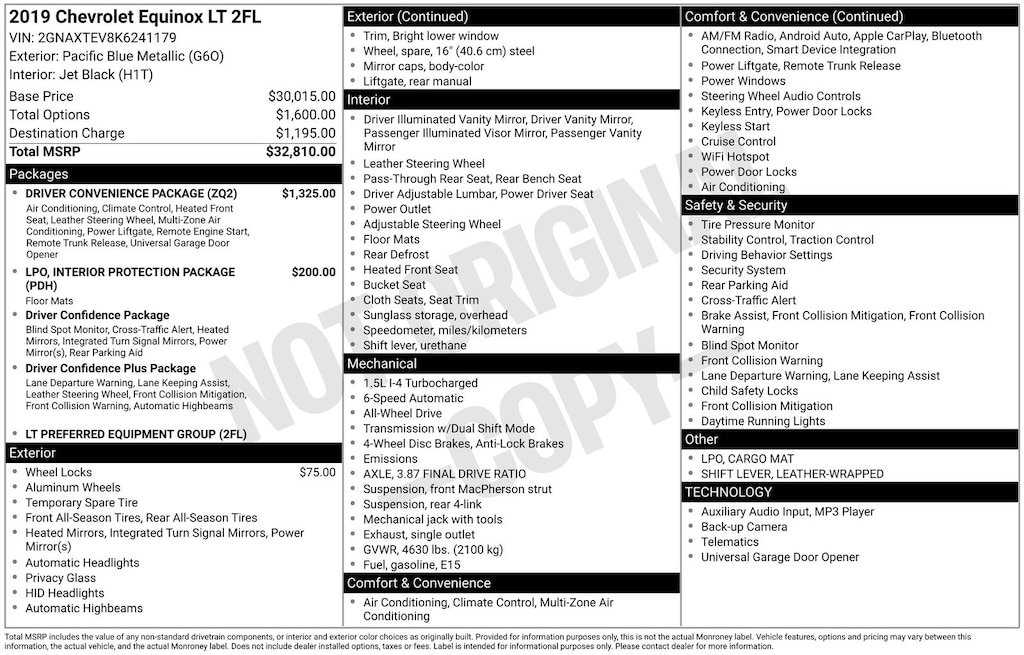 Clean CARFAX. Certified. 2019 Chevrolet Equinox LT Is nicely equipped with Driver Confidence Package (Lane Change Alert w/Side Blind Zone Alert, Outside Heated Power-Adjustable Mirrors, Rear Cross Traffic Alert, and Rear Park Assist w/Audible Warning), Driver Confidence Plus Package (3-Spoke Leather-Wrapped Steering Wheel, Following Distance Indicator, Forward Collision Alert, Front Pedestrian Braking, IntelliBeam Auto High Beam Headlamp Control, Lane Keep Assist w/Lane Departure Warning, and Low Speed Forward Automatic Braking), Driver Convenience Package (Dual Zone Automatic Climate Control, Heated Driver & Front Passenger Seats, Leather-Wrapped Shift Lever, Rear Power Liftgate, Remote Vehicle Starter System, and Universal Home Remote), Interior Protection Package (LPO) (All-Weather Floor Mats and Cargo Mat), Preferred Equipment Group 2FL, Ford Blue Advantage: Blue Certified Certified, AWD, 17" Aluminum Wheels, 2 Rear USB Charging-Only Ports, 2 USB Ports & Auxiliary Input Jack, 2-Way Power Driver Lumbar Control Seat Adjuster, 3.87 Final Drive Axle Ratio, 4-Wheel Disc Brakes, 6 Speaker Audio System Feature, 6 Speakers, 8-Way Power Driver Seat Adjuster, ABS brakes, Air Conditioning, Alloy wheels, AM/FM radio: SiriusXM, Apple CarPlay/Android Auto, Auto High-beam Headlights, Bluetooth® For Phone, Brake assist, Bumpers: body-color, Compass, Delay-off headlights, Driver door bin, Driver vanity mirror, Dual front impact airbags, Dual front side impact airbags, Electronic Stability Control, Emergency communication system: OnStar and Chevrolet connected services capable, Four wheel independent suspension, Front anti-roll bar, Front Bucket Seats, Front Center Armrest, Front Passenger 4-Way Manual Seat Adjuster, Front reading lights, Fully automatic headlights, Heated door mirrors, High-Intensity Discharge Headlights, Illuminated entry, Low tire pressure warning, Occupant sensing airbag, Outside temperature display, Overhead airbag, Overhead console, Panic alarm, Passenger door bin, Passenger vanity mirror, Power door mirrors, Power driver seat, Power steering, Power windows, Premium audio system: Chevrolet MyLink, Premium Cloth Seat Trim, Radio data system, Radio: Chevrolet Infotainment 3 System w/AM/FM, Rear anti-roll bar, Rear reading lights, Rear seat center armrest, Rear window defroster, Rear window wiper, Remote keyless entry, Security system, Set of 4 Wheel Locks (LPO), SiriusXM Radio, Speed control, Speed-sensing steering, Split folding rear seat, Spoiler, Steering wheel mounted audio controls, Tachometer, Telescoping steering wheel, Tilt steering wheel, Traction control, Trip computer, Turn signal indicator mirrors, and Variably intermittent wipers.