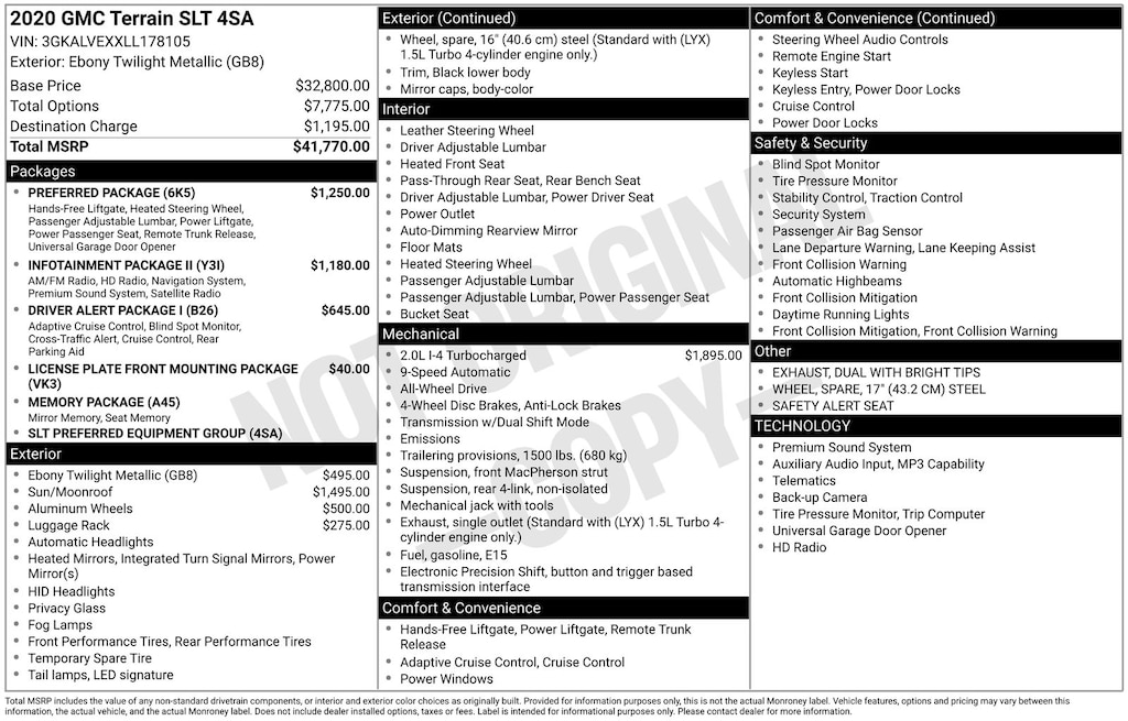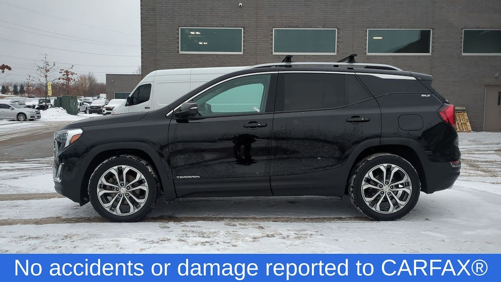 Clean CARFAX. Certified. 2020 GMC Terrain SLT Is nicely equipped with Driver Alert Package I (Adaptive Cruise Control - Camera, Lane Change Alert w/Side Blind Zone Alert, Rear Cross-Traffic Alert, Rear Park Assist, and Safety Alert Seat), Infotainment Package II (Radio: GMC Infotainment Audio System w/Navigation, HD Radio, and Premium 7-Speaker Bose Sound System w/Amplifier), License Plate Front Mounting Package, Memory Package, Preferred Equipment Group 4SA, Preferred Package (6-Way Power Front Passenger Seat, Hands-Free Rear Power Programmable Liftgate, Heated Steering Wheel, Universal Home Remote, and Front Passenger 2-Way Power Lumbar), Ford Blue Advantage: Blue Certified Certified, AWD, 2 USB Data Ports, 2 USB Data Ports w/SD Card Reader, 4-Way Manual Front Passenger Seat, 4-Wheel Antilock 4-Wheel Disc Brakes, 4-Wheel Disc Brakes, 6 Speakers, 6-Speaker Audio System Feature, 8-Way Power Driver Seat Adjuster, ABS brakes, Air Conditioning, Alloy wheels, AM/FM radio: SiriusXM, Apple CarPlay/Android Auto, Auto High-beam Headlights, Auto-dimming door mirrors, Auto-dimming Rear-View mirror, Automatic temperature control, Bluetooth® For Phone, Brake assist, Bumpers: body-color, Compass, Delay-off headlights, Driver & Front Passenger Heated Seats, Driver door bin, Driver vanity mirror, Dual Exhaust w/Bright Tips, Dual front impact airbags, Dual front side impact airbags, Electronic Stability Control, Emergency communication system: OnStar and GMC connected services capable, Exterior Parking Camera Rear, Four wheel independent suspension, Front anti-roll bar, Front Bucket Seats, Front Center Armrest, Front dual zone A/C, Front fog lights, Front reading lights, Fully automatic headlights, Heated door mirrors, Heated front seats, High-Intensity Discharge Headlights, Illuminated entry, Lane Departure Warning System, Low tire pressure warning, Occupant sensing airbag, Outside temperature display, Overhead airbag, Overhead console, Panic alarm, Passenger door bin, Passenger vanity mirror, Perforated Leather-Appointed Seat Trim, Power door mirrors, Power Driver Lumbar Control, Power driver seat, Power steering, Power windows, Radio data system, Radio: GMC Infotainment Audio System w/8" Display, Rear anti-roll bar, Rear seat center armrest, Rear window defroster, Rear window wiper, Remote keyless entry, Roof Rack Cross Rails (LPO), Roof rack: rails only, Security system, SiriusXM Radio, Skyscape Power Sunroof w/Power Sunscreen, Speed control, Speed-sensing steering, Split folding rear seat, Spoiler, Steering wheel mounted audio controls, Tachometer, Telescoping steering wheel, Tilt steering wheel, Traction control, Trip computer, Turn signal indicator mirrors, Variably intermittent wipers, Wheels: 18" x 7" Machined Aluminum w/Gray Accents, and Wheels: 19" x 7.5" Machined Aluminum w/Gray Accents.