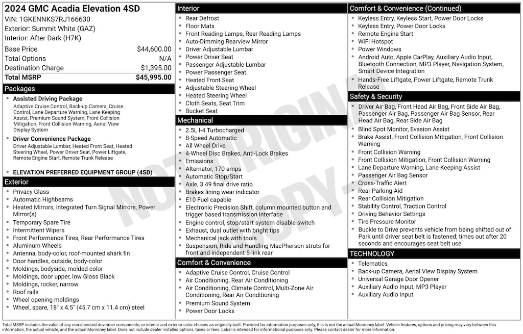 Certified. 2024 GMC Acadia Elevation Is nicely equipped with Preferred Equipment Group 4SD, Ford Blue Advantage: Blue Certified Certified, AWD, After Dark Cloth, 12 Speakers, 3.49 Final Drive Axle Ratio, 3rd row seats: split-bench, 4-Wheel Disc Brakes, 6-Way Power Front Passenger Seat Adjuster, 7-Passenger Seating (2-2-3 Seating Configuration), 8-Way Power Driver Seat Adjuster, ABS brakes, Air Conditioning, Alloy wheels, AM/FM radio: SiriusXM with 360L, Apple CarPlay/Android Auto, Auto High-beam Headlights, Auto-dimming Rear-View mirror, Automatic temperature control, Bodyside moldings, Bose Performance 12-Speaker System w/Sub-woofer, Brake assist, Bumpers: body-color, Compass, CoreTec Seat Trim, Delay-off headlights, Driver 4-Way Power Lumbar Seat Adjuster, Driver door bin, Driver vanity mirror, Dual front impact airbags, Dual front side impact airbags, Electronic Stability Control, Emergency communication system: OnStar and GMC connected services capable, Exterior Parking Camera Rear, Four wheel independent suspension, Front anti-roll bar, Front Bucket Seats, Front Center Armrest, Front dual zone A/C, Front fog lights, Front Passenger 4-Way Power Lumbar Seat Adjuster, Front reading lights, Fully automatic headlights, Garage door transmitter, Heated door mirrors, Heated Driver & Front Passenger Seats, Heated front seats, Heated steering wheel, Illuminated entry, Leather steering wheel, Low tire pressure warning, Navigation System, Occupant sensing airbag, Outside temperature display, Overhead airbag, Overhead console, Panic alarm, Passenger door bin, Passenger vanity mirror, Power door mirrors, Power driver seat, Power Liftgate, Power passenger seat, Power steering, Power windows, Radio data system, Radio: 15" Premium GMC Infotainment System, Rear air conditioning, Rear anti-roll bar, Rear reading lights, Rear side impact airbag, Rear window defroster, Rear window wiper, Remote keyless entry, Security system, SiriusXM w/360L, Speed control, Speed-sensing steering, Split folding rear seat, Spoiler, Sport steering wheel, Steering wheel mounted audio controls, Tachometer, Telescoping steering wheel, Tilt steering wheel, Traction control, Trip computer, Turn signal indicator mirrors, Variably intermittent wipers, Voltmeter, and Wheels: 20" x 8" Bright Silver Aluminum.