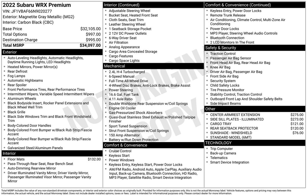 Recent Arrival! Clean CARFAX. Certified. 2022 Subaru WRX Premium Is nicely equipped with Standard Model (6MT), Ford Blue Advantage: Blue Certified Certified, 4-Wheel Disc Brakes, 6 Speakers, ABS brakes, Air Conditioning, All-Weather Floor Liners, Alloy wheels, AM/FM radio: SiriusXM, Auto High-beam Headlights, Auto-dimming Rear-View mirror, Automatic temperature control, Brake assist, Bumpers: body-color, Cargo Tray, Center Armrest Extension, Cloth Upholstery w/Red Stitching, Driver door bin, Driver vanity mirror, Dual front impact airbags, Dual front side impact airbags, Electronic Stability Control, Emergency communication system: STARLINK Safety and Security (Subscription Required), Exterior Parking Camera Rear, Four wheel independent suspension, Front anti-roll bar, Front Bucket Seats, Front Center Armrest, Front dual zone A/C, Front fog lights, Front reading lights, Fully automatic headlights, Heated door mirrors, Heated front seats, Illuminated entry, Knee airbag, Leather Shift Knob, Leather steering wheel, Low tire pressure warning, Occupant sensing airbag, Outside temperature display, Overhead airbag, Overhead console, Panic alarm, Passenger door bin, Passenger vanity mirror, Performance Design Heated Front Bucket Seats, Power door mirrors, Power steering, Power windows, Radio data system, Radio: Subaru STARLINK 11.6" Multimedia Plus Sys, Rear anti-roll bar, Rear seat center armrest, Rear Seatback Protector, Rear window defroster, Remote keyless entry, Security system, Side Sill Plates - Illuminated, Speed control, Speed-sensing steering, Split folding rear seat, Spoiler, Sport steering wheel, STARLINK/Apple CarPlay/Android Auto, Steering wheel mounted audio controls, Sunshade - Windshield, Tachometer, Telescoping steering wheel, Tilt steering wheel, Traction control, Trip computer, Variably intermittent wipers, and Wheels: 18" x 8.5" Dark Gray Finish Alum Alloy.