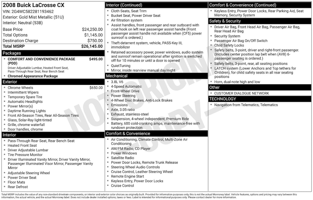 Recent Arrival! 2008 Buick LaCrosse CX Is nicely equipped with Comfort & Convenience Package (Driver 2-Way Power Lumbar Seat Adjuster, Heated Driver & Front Passenger Seats, and Rear Split-Folding Seat), 16" Steel Wheels w/Wheel Covers, 4-Wheel Disc Brakes, 6 Speakers, ABS brakes, Air Conditioning, AM/FM radio: XM, AM/FM Stereo w/CD Player/XM Satellite, Automatic temperature control, Bodyside moldings, Bumpers: body-color, CD player, Cloth Seat Trim, Compass, Delay-off headlights, Driver door bin, Driver vanity mirror, Dual front impact airbags, Emergency communication system: OnStar Directions & Connections, Four wheel independent suspension, Front anti-roll bar, Front Bucket Seats, Front Center Armrest, Front dual zone A/C, Front reading lights, Fully automatic headlights, Illuminated entry, Leather steering wheel, Low tire pressure warning, Occupant sensing airbag, Outside temperature display, Overhead airbag, Panic alarm, Passenger door bin, Passenger vanity mirror, Power door mirrors, Power driver seat, Power steering, Power windows, Rear anti-roll bar, Rear seat center armrest, Rear window defroster, Remote keyless entry, Security system, Speed control, Steering wheel mounted audio controls, Tachometer, Telescoping steering wheel, Tilt steering wheel, Traction control, Trip computer, Variably intermittent wipers, Voltmeter, and XM Satellite Radio.